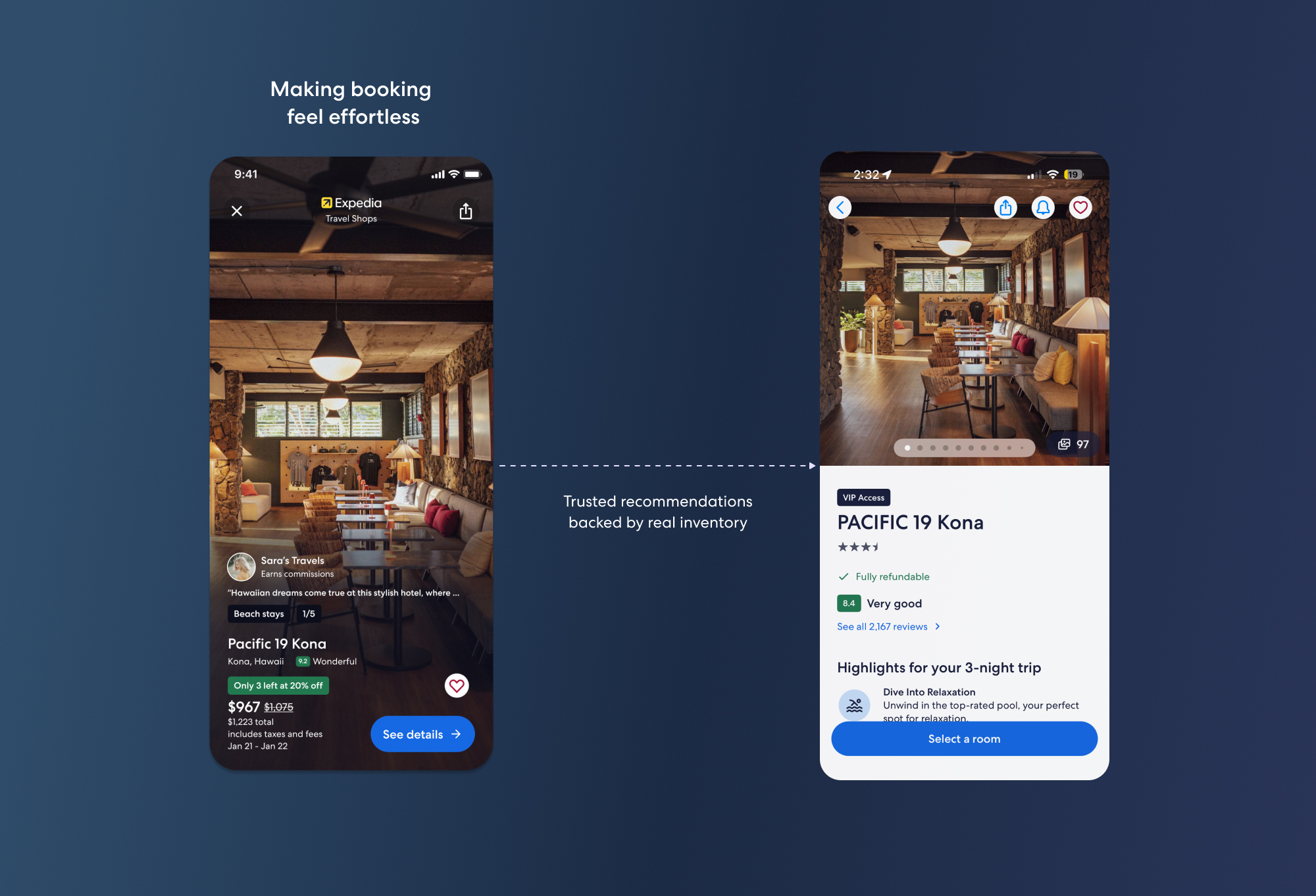 By pairing creator recommendations with Expedia’s trust signals — reviews, refundability, and availability — the experience balances personality with credibility, making booking feel natural and low-risk.